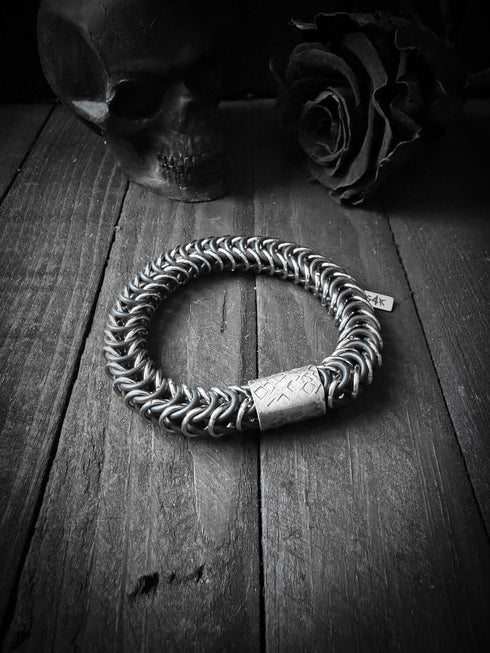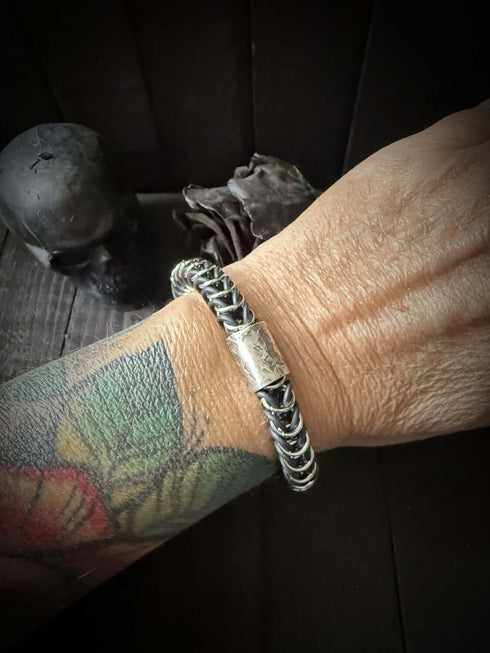 La Pulsera Tubular Elástica Tubo de la colección Crush es el complemento perfecto para la gargantilla del mismo nombre. Este diseño unisex combina la flexibilidad de la malla elástica tubular con una pieza central de plata texturizada a golpe de martillo, que aporta un toque artesanal y sofisticado. Disponible en dos opciones: con un detalle de calavera para un estilo más atrevido o con solo el tubo texturizado para un look más minimalista. El cierre de acero asegura comodidad y resistencia, ideal para el día a día.